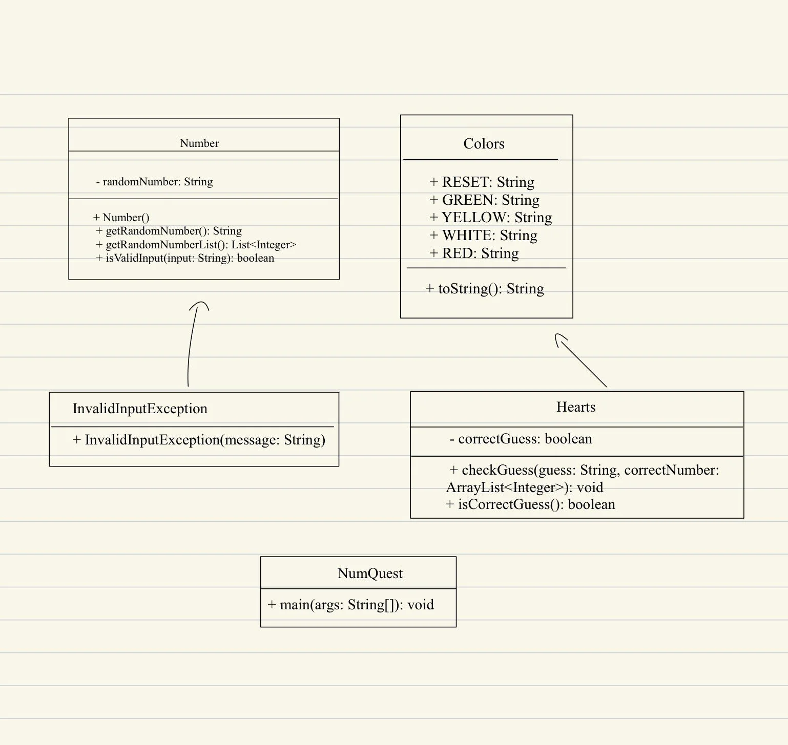 In terms of skills I revisited, I worked more on handling user input and giving feedback. This was something I had done in earlier projects, but NumQuest gave me the chance to improve it. I also got better at creating UML diagrams to plan out the project before coding, which helped me visualize the structure of the game.